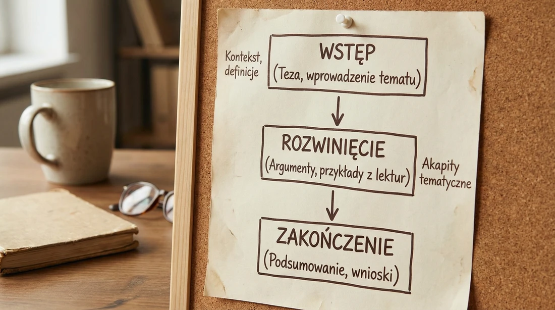Przykład struktury rozprawki maturalnej napisany na tablicy lub kartce - wstęp, rozwinięcie, zakończenie z krótkimi objaśnieniami